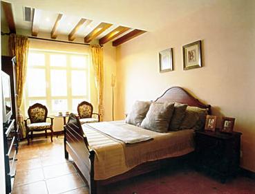 掛畫和壁燈:掛畫相對于墻面來說依然要置于前景,所以選用了更深于墻面的咖啡色做邊框色,里面裝裱了一幅不淡不濃的畫。壁燈其實就是燭臺,花草枝蔓自然生長形成的攀巖效果和窗簾布藝、坐椅布藝相呼應。