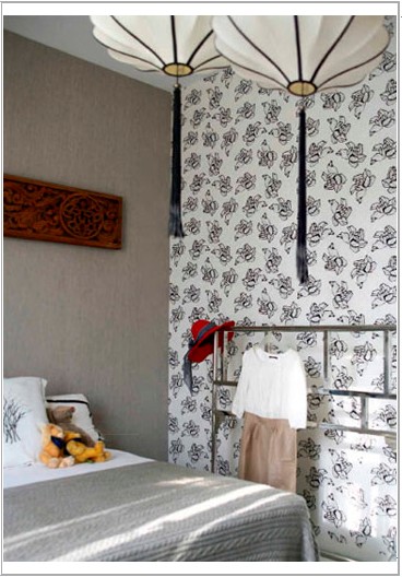拖去老中的承重的步伐,我們以輕快、時(shí)尚的新中式來(lái)裝點(diǎn)屬于兩個(gè)人的世界。當(dāng)然即使是新中式,也不能一味堆砌中式元素。中式床榻經(jīng)過(guò)改良,線條流暢,時(shí)尚感十足,搭配色彩華麗的地毯,與墻上的裝飾畫(huà)相映成趣,大面積的灰色磚墻,中和了地毯的鮮艷,保持了空間的含蓄低調(diào)。
