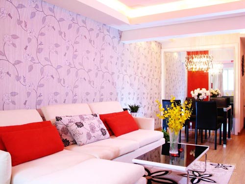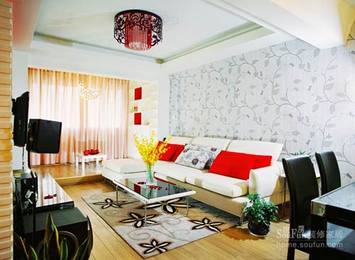 柔和的燈光映襯下,張揚的紅色靠墊和衣帽間紅色移門遙相呼應,客廳頓時暖意橫生。花朵壁紙使寬闊的客廳墻面不再寂寞,平添幾分嫵媚,此外,壁紙與黑白花朵的靠墊、黑白毛絨地毯之間也是空間上運用得極細致而成功的設計。整個客廳看下來,所有的元素組合起來就是打造暖冬家居的一個相當成功的例證。