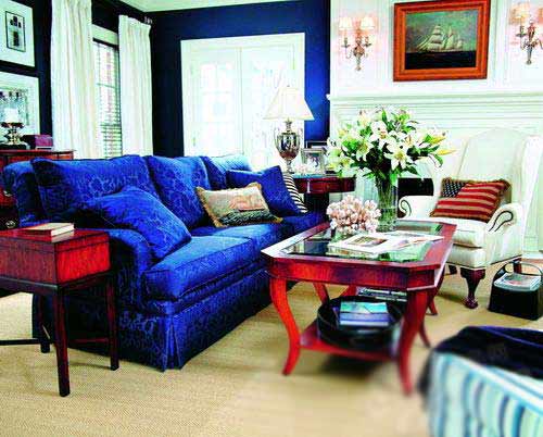 如果你家的客廳具備古典歐式的設(shè)計元素,可以選擇藍(lán)白分明的沙發(fā)和墻面裝飾,利用視覺上的通透感,讓客廳顯現(xiàn)出一種明朗的寒季味道。白色靠背椅與考究木色的茶幾、邊幾增添無限暖意。