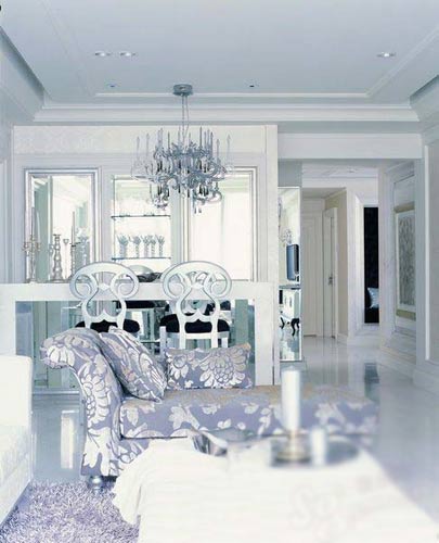 醉心于雪白魅力的客廳,用溫潤的灰色印銀花的座榻和銀灰色窗簾來打破冰冷,營造出富有層次感的暖意。