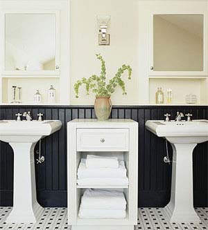 水盆上方的一對(duì)墻面柜可以用來存放牙膏、漱口水、阿司匹林等用品。經(jīng)常會(huì)使用的用品,如肥皂、洗發(fā)沐浴用品、香水、化妝品等就存放在墻柜下方的置物格里。兩個(gè)水盆之間的櫥柜就用來存放毛巾和浴衣等。