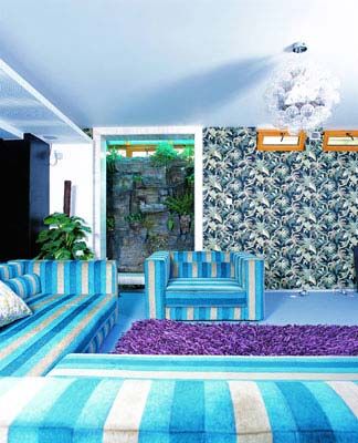 打開聽覺、視覺,一切感觀。自然的采光景觀和綠色墻紙挑起一屋的清雅。深灰藍(lán)地面、條紋沙發(fā)支起一墻攀滕。
