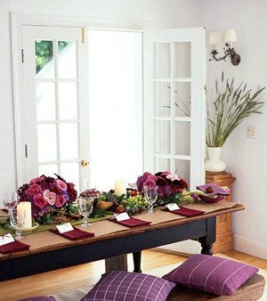 紫色軟飾的點(diǎn)綴。在大量留白的空間基調(diào)里,只需適當(dāng)運(yùn)用一些紫色的布藝,比如紫白色相間的靠包,葡萄般的紫色餐巾布和紫紅色的花朵,即能讓平淡的空間立刻轉(zhuǎn)性。 喜歡在家里做一些復(fù)雜造型的裝修方式,已漸被拋棄。簡(jiǎn)潔的家居設(shè)計(jì)可使房間顯得通透、明亮、寬敞,受到了人們的青睞。