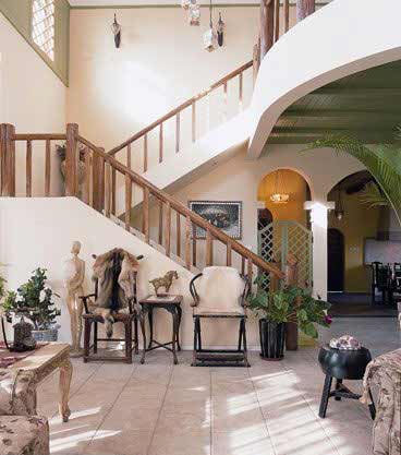 貫穿于廳堂的原木樓梯,是美式鄉(xiāng)村風(fēng)格的典型特征,木材紋理清晰。明黃的墻壁,自然、懷舊,仿佛聞到了濃郁泥土的芬芳。