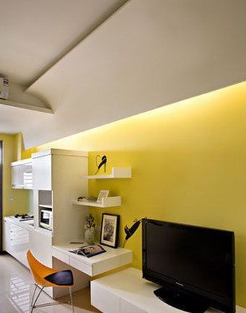 開放型的小廚房,整體的色調(diào)與造型都以現(xiàn)代簡約風格為主,流暢的直線設計。白色的兩人小餐桌色調(diào)純凈,與暖黃色背景墻對比非常和諧,色彩搭配分外出彩,讓人一下子有了親近自然的舒適感。