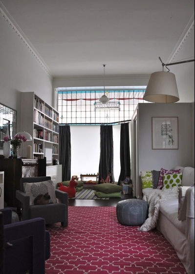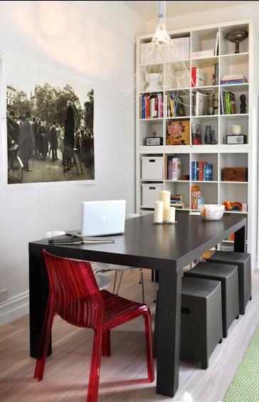 二樓又重現(xiàn)了粉色浪漫,在這個滿是書香氣息的書房里,沿用一樓的粉紅色地毯和單人沙發(fā),保持室內(nèi)設(shè)計主題的一致性。L型設(shè)計的書柜,貼合墻壁,直接到房頂,能更好地利用墻角的位置,又能更好的利用收納空間