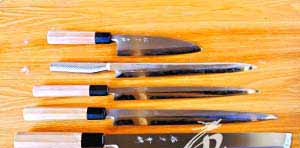 這些刺身刀按外形可分為兩類,一類刀背較厚,有將近半寸,尖頭短身,多用來斬魚頭及起魚肉,可以輕易斬斷魚骨,稱之為出刃庖刀。另一類則稱為柳刃庖刀(又稱萬能刀),刀鋒薄而刀身較長,用以將大塊魚肉切成等份或切片狀的刀,如果按用途分,則可分為去鱗、橫剖、縱剖、切骨等用刀。