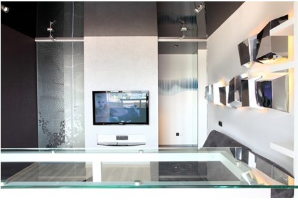 灰鏡飾面的吊頂加上幾桶射燈,舍去了那些平凡、復(fù)雜的造型,打造出別樣的風(fēng)味。整個空間的造型都以簡潔為主,不管是墻面造型,還是沙發(fā)造型,用灰白做為主色調(diào)。L型的沙發(fā),從此角度看過去也拉伸了空間度。