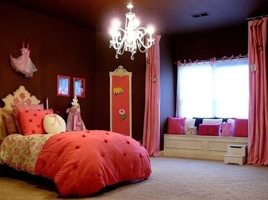 紅色是熱情的,熱情如火的紅。整個(gè)臥室都以紅色為基調(diào),或深或淺,熱情四溢。墻壁上裝飾的小公主裙,各色小花,以及帶立體圓球的被子,使得公主臥室非常可愛。