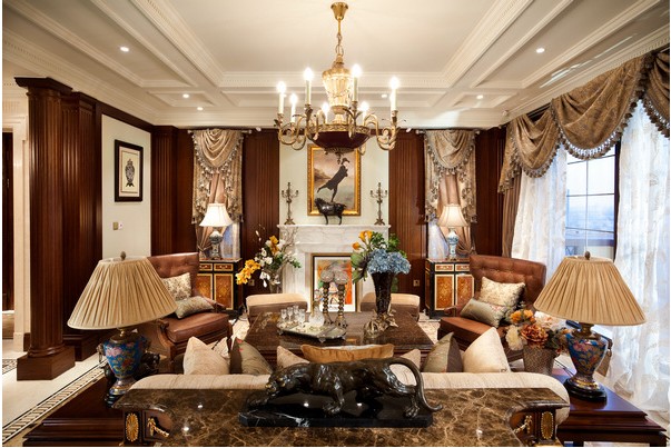 客廳里融入了歐式的裝修風(fēng)格,大墻面柱子等方面又能看到東方中式文化的影子。