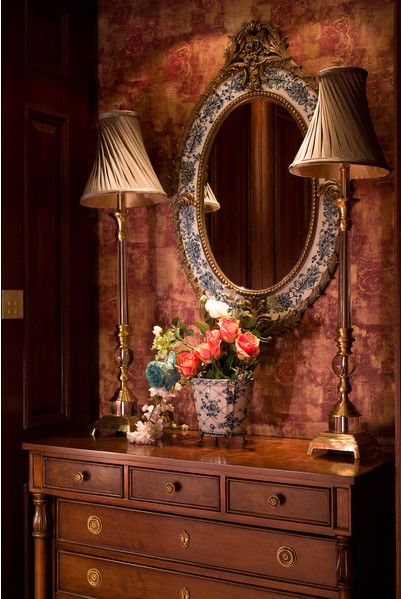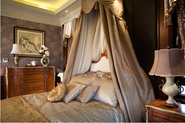 臥室里從細(xì)節(jié)到主調(diào)都是濃濃的歐式貴族風(fēng)情。洛可可時(shí)期對(duì)女性文化的推崇在這里得到了充分的展現(xiàn)。