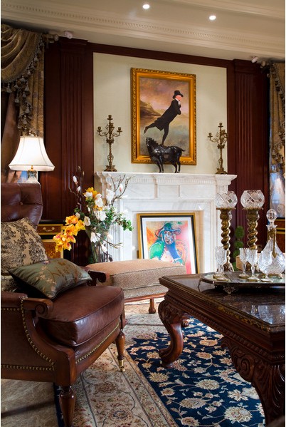 硬朗的皮革、壁爐的石材讓這個(gè)空間顯得大氣婉約。而碎花的地毯又不會(huì)讓空間顯得過(guò)于拘謹(jǐn)和莊重,而壁爐上方的滑稽圖片又會(huì)起居室里增添一比輕松愉悅的氣氛。
