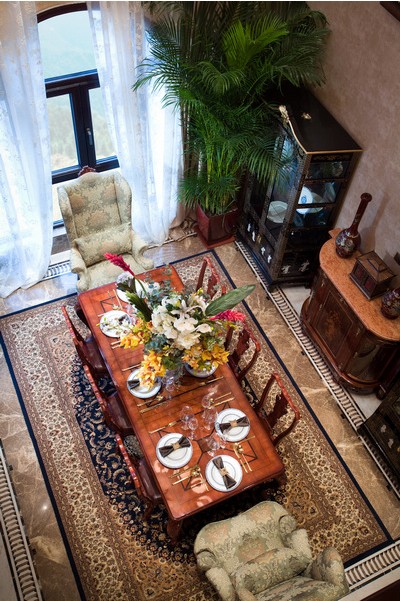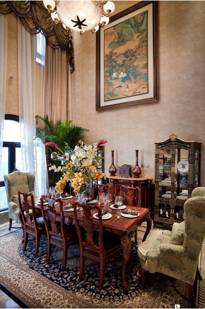 從頂上看這個(gè)餐廳發(fā)現(xiàn)它是極具儀式感的,這個(gè)七米挑高的餐廳中,擁有諾大的馬蹄形的拱窗上以及它整面墻掛的窗簾。這樣無(wú)形中增強(qiáng)了空間大挑高的視覺(jué)效果。雖然中式的餐桌椅,但是無(wú)論是餐桌椅的擺設(shè)還是餐具的擺放位置都是濃濃文藝復(fù)興時(shí)期的歐洲式的優(yōu)雅,這些細(xì)微的小細(xì)節(jié)無(wú)形中為空間帶來(lái)無(wú)限的靈性與貴氣。