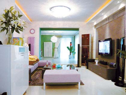 女主人非常喜歡紫色,沙發(fā)、電器等選購的都是紫紅色。因此設(shè)計師用淡紫色壁紙鋪帖電視背景墻,使硬裝修部分和家具搭配很協(xié)調(diào),營造出浪漫嫵媚的效果。同時馬賽克做電視背景墻也是一大創(chuàng)新,馬賽克流暢的線條感和時尚的大花壁紙個性化地搭配在一起,巧妙地呈現(xiàn)出優(yōu)雅時尚的墻面層次。