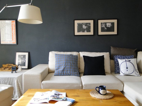 色彩將客廳空間里裝飾的層次分明,沙發(fā)映稱著墨藍(lán)的墻面,顯得干凈明了。有時候時尚就是這么簡單。