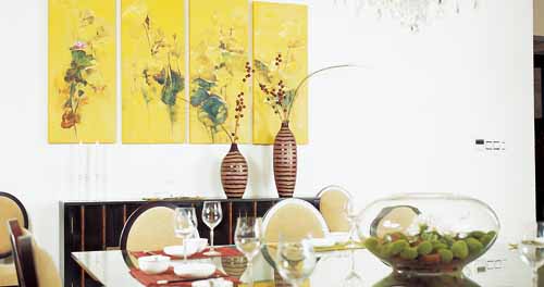 餐廳的墻面加以黃色的組畫(huà)裝飾不僅能增添用餐食欲,而且也讓空間富有暖意