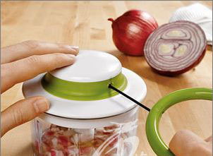 它的原理與普通的攪拌機類似,不同之處在于采用了全手動的設(shè)計,只要將洋蔥放進去,然后用力拉扯上面的繩子,就可以迅速將洋蔥切碎了。