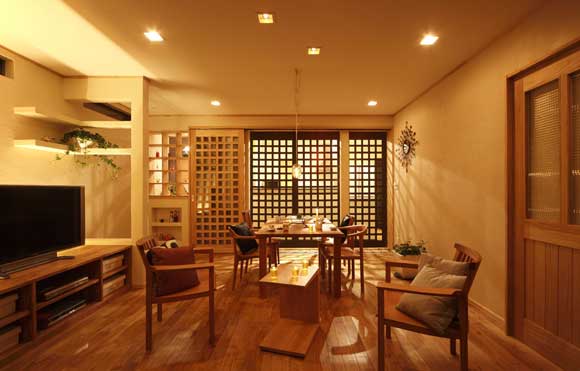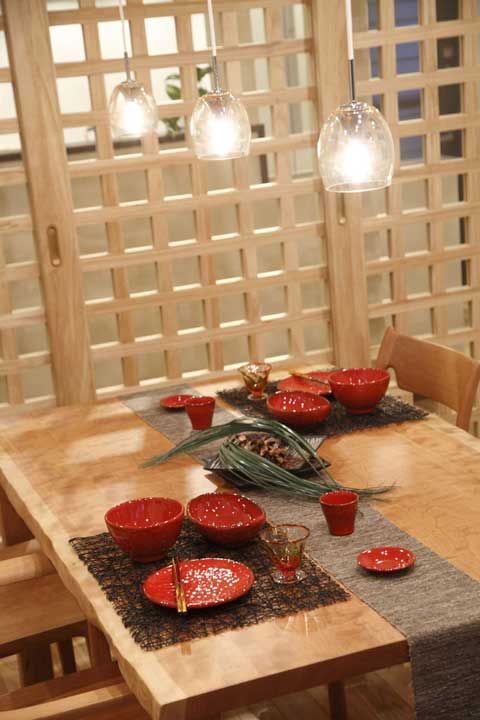 飯廳里的桌椅都是木頭做的,上圖為自色光線情況下,有著另外一翻情調(diào)。燈光穿過(guò)格子屏風(fēng)投影在墻上,繪出交錯(cuò)的線條,光與影的藝術(shù)讓這個(gè)飯廳顯得與別不同。格子屏風(fēng)是裝飾上的一大美點(diǎn)所在。