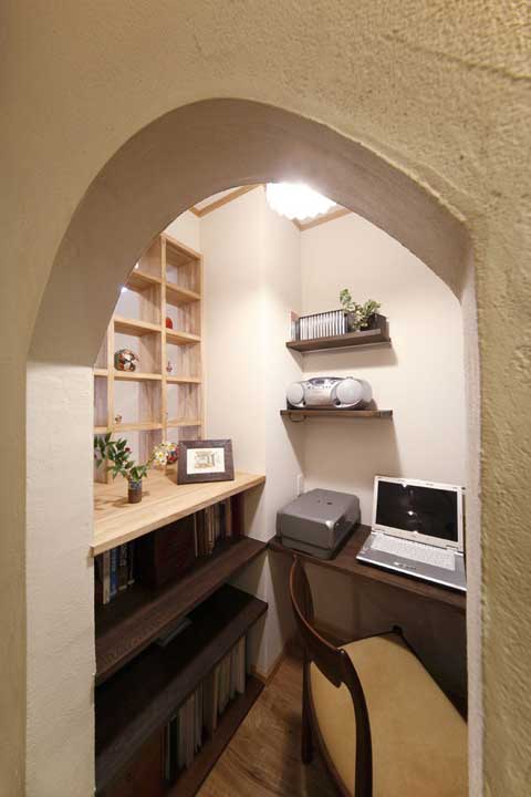 對(duì)應(yīng)著廚房的另一個(gè)角落,原先可以說(shuō)一個(gè)家居死角,改良后成為一個(gè)小小的工作間,加以拱形的門(mén)設(shè)計(jì),又多了一些些活潑可愛(ài)的格調(diào)。