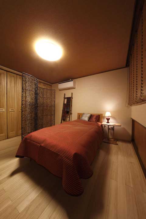 大大的暖色調(diào)臥室,腥紅色家居軟品。地板采用柔軟舒適的桐木地板,天花鋪貼木絹壁紙,紋理特別。床的一旁是藤制的屏風(fēng),若隱若現(xiàn)的感覺(jué),充滿神秘感,相當(dāng)有情調(diào)呢。