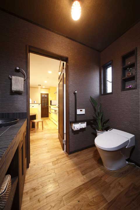 衛(wèi)生間里采用墻紙鋪貼有點(diǎn)像樹(shù)木表皮的感覺(jué),配上綠色植物,讓人有種置身于熱帶雨林的錯(cuò)覺(jué),這種風(fēng)格非常純樸,當(dāng)之森林系家居!