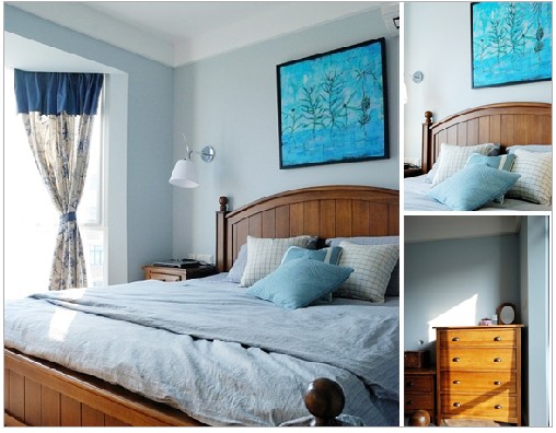 房間用色干凈、明快,藍色、白色以及原木本色、碎花點綴,有著田園的閑適,地中海的蔚藍。整個室內房間采光很好,空間顯得大而通透。