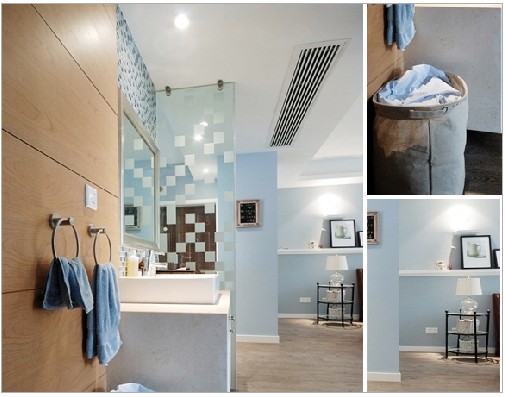 藍色的墻面,搭配白色潔具,以及空間里湖藍色的邊柜和淺棕實木地板,將藍與白不同程度的對比與運用發(fā)揮到了頂點。
