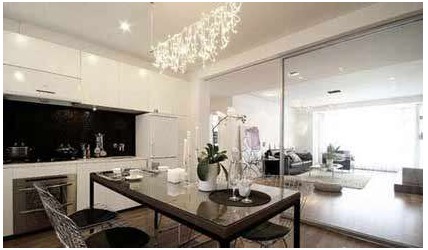 地板由客廳直接鋪裝到廚房,令兩者之間視覺上貫通性極佳,還增加了空間延伸的感覺。倉(cāng)儲(chǔ)柜美觀實(shí)用,配備六把餐椅的大餐桌布置得很正式。操作臺(tái)作一字型設(shè)計(jì),寬大的餐桌烹飪時(shí)可以作臨時(shí)備菜臺(tái),使用起來(lái)很方便。