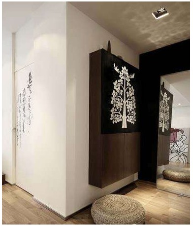 把電視臥入墻里,使屏幕與墻體保持水平,在兩側(cè)均勻打上小孔不會(huì)影響聲音效果。書房門運(yùn)用隱藏式的設(shè)計(jì)理念,沒有制作門口,使得視聽墻具有很好的整體效果,書房門面寫著古詩(shī)書法,宣紙質(zhì)感配以草墩將一絲禪意緩緩的流露出來(lái)。