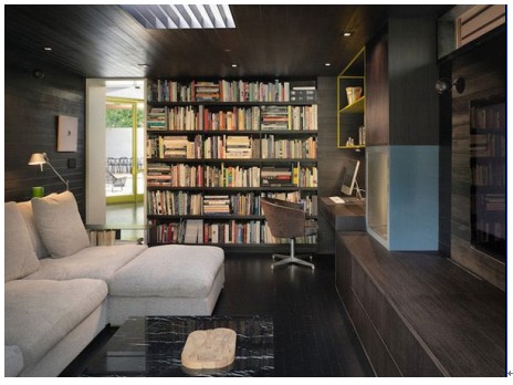 書架上琳瑯滿目的書籍,暫居一大片墻面,黑色深沉的空間內(nèi)添加一絲亮色,也讓人的思緒平靜,可以專心于工作。大面工作及整排高書,提供在家辦公的需求。