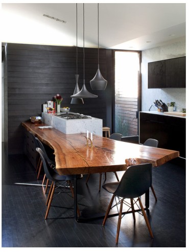 整個空間大面積運用了黑色,所以在選擇餐桌時選用了土黃色的原木。只有一面黑色的背景墻與地面櫥柜相呼應(yīng),既有整體性又不壓抑。