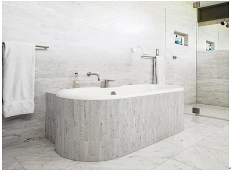 現(xiàn)代風格的衛(wèi)浴間裝飾設(shè)計,墻面/地磚/浴缸均以淺灰色為主,鋪設(shè)上講究簡單明了。黑白灰的衛(wèi)浴空間同一色系,使得衛(wèi)浴間增添了不少通透感。