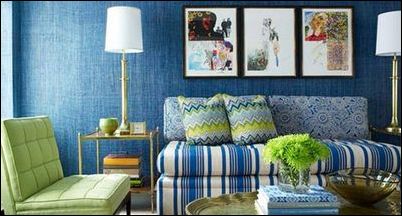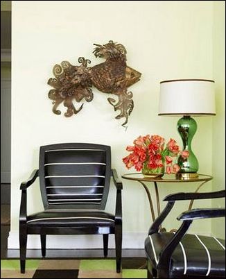 另一個(gè)小起居室,從綠色“做主”演變到藍(lán)色“當(dāng)家”,嫩綠的色彩作為點(diǎn)綴。墻上的版畫是裝飾的重點(diǎn)。