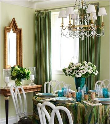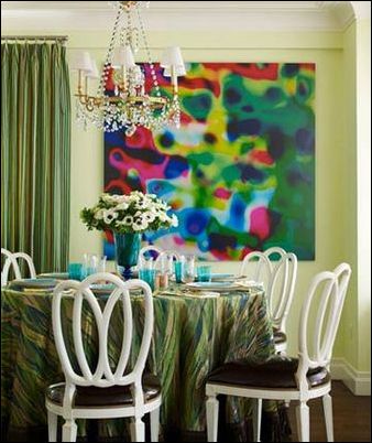 餐廳與客廳相連,同樣圍繞綠色鋪開,色澤選用得當(dāng),再配上白色的椅子和吊燈,避免了過強(qiáng)的視覺刺激。五彩斑斕的版畫是唯一比較夸張的點(diǎn)綴。