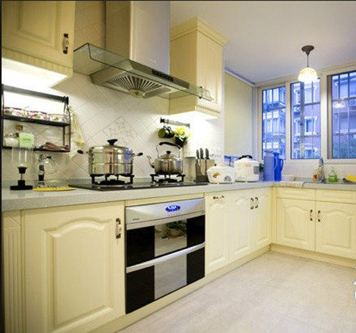這個廚房面積不錯的,俗話說巧婦也是需要練成的。L型的廚柜使廚房更顯寬大,藍色的有機玻璃透著光潔的光,廚房也顯得干凈明亮許多。