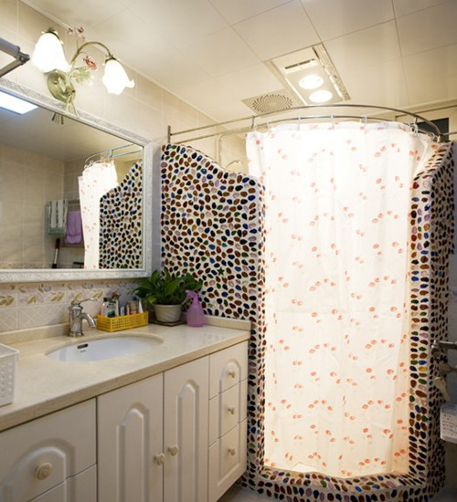 衛(wèi)生間里其它地方都是常見的,唯有這個淋浴房,半開放式的馬賽克拼接,既有童趣亦會增加視覺美感。