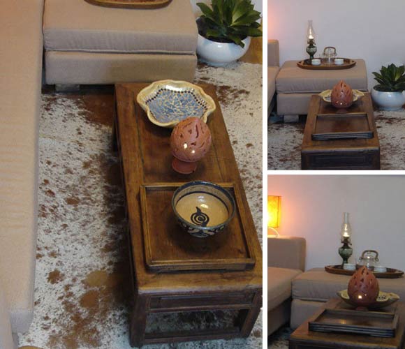 現(xiàn)在我們來(lái)細(xì)看MM在客廳里的得意之作吧。看著地面上似乎有很多垃圾,其實(shí)它是一張獨(dú)特的地毯,MM說(shuō)他在高原上第一眼就看上了它,蜚它不可就買(mǎi)了回來(lái)。為了讓這張地毯發(fā)揮更大的作用,特意又淘了這個(gè)復(fù)古的茶幾回來(lái)。