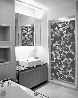 在吉盛偉邦建材館名家建材衛(wèi)浴展廳,記者體驗到了由意大利設(shè)計師詮釋的整體衛(wèi)浴帶來的震撼:黑、白、淺棕和暗綠的四色馬賽克取代了瓷磚,像一道瀑布從天花板順著墻壁飛流直下,越過浴缸的平臺,流向整個地面,酣暢淋漓;而由名師設(shè)計的柱形洗面盆、馬桶、浴缸則把墻面、地面讓人有了靜靜沐浴的念頭;黑白的乳牛紋休閑椅是休息時的最好依靠,就連腳邊的卵石都是要讓人感受到一種“聚天地之靈氣”的大自然氛圍,衛(wèi)浴間不一定要大,但整體的感覺卻一點都不能少。