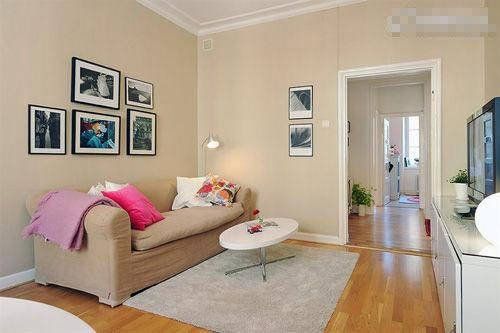 這個(gè)淡淡茶色的墻壁與深色的沙發(fā)相呼應(yīng),有著層次分明的搭配感。而顏色艷麗的軟軟靠墊則又是一鮮明的跳躍感。茶幾是簡約風(fēng)格的,連同短毛地毯也是簡潔的裝飾物。電視柜則是一個(gè)很好的收納空間,可以有效的收放家里所有的影碟,樂盤等等。這個(gè)房型實(shí)用面積不超過60平,風(fēng)格有點(diǎn)北歐的感覺,不過卻是用現(xiàn)代的手法裝修,在軟裝飾上借用了北歐,這樣可以放大利用空間。