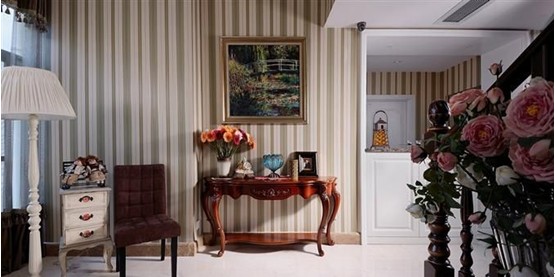 挑高的客廳是空間的最佳主角,繁復古優(yōu)美的吊燈傾瀉而下,在冷色調為主的空間里營造出溫暖的氛圍。豎紋線條的壁紙色彩清雅,增添了空間的立體動感,對立墻面上的兩幅油畫畫作則與之遙相呼應,構成活潑的空間動線。