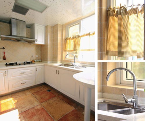 復(fù)古的地磚,白色的櫥柜,這里色彩的作用至關(guān)重要。暖暖的土黃色調(diào)是鮮明的主色,飄窗的小窗簾流露出田園風(fēng)情,表達(dá)出鄉(xiāng)村田園的簡樸和溫馨。