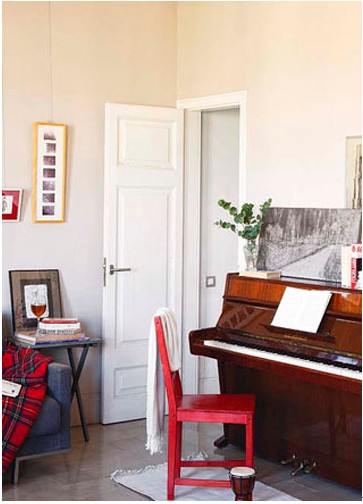 深棕色鋼琴給這個空間增添了不少藝術氣息,而造型簡單的紅色靠椅會顯得空間沒那么單調,總能讓人心情愉悅。