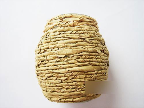 在瓶子表面貼上雙面膠。把紙繩從底部開始一圈一圈繞著瓶子纏,纏的過程中,用手按壓,使其粘得牢固。
