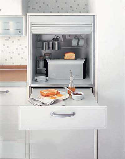 既可作為簡潔的早餐臺,又可以作為烹飪操作的料理臺,用折疊式軌道將餐臺收藏在柜體里,就是一個抽屜的外觀,很節(jié)省空間。