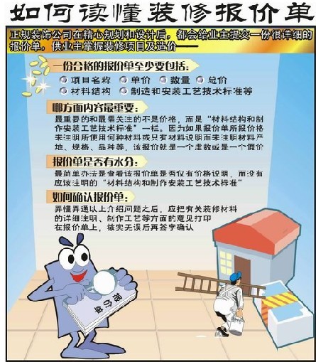 這是因?yàn)?,家庭裝修也應(yīng)有一個(gè)造價(jià)預(yù)算的程序:材料費(fèi)、施工費(fèi)、管理費(fèi)、利潤等都應(yīng)該明確。而沒有信譽(yù)、質(zhì)量和服務(wù)保證的裝修公司或施工隊(duì)往往采取一口報(bào)價(jià)或低于別人報(bào)價(jià)的做法承攬業(yè)務(wù)。