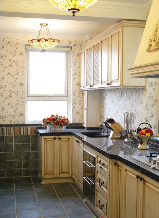 廚房的地面是仿古磚,它比較耐臟,比較適合用在這個空間里。很多人家不敢在廚房里采用壁紙,害怕不好打理,不過對于追求精致時尚生活的人是不在意這些的。