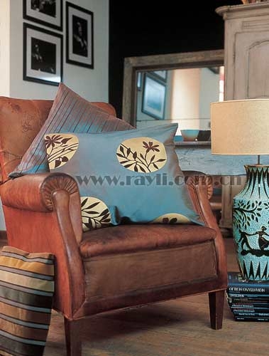 為高級而古老的真皮坐椅搭配靠墊,具有中國詩畫韻味的圖案成為獨(dú)特而高貴的選擇。清雅的灰色透露著濃縮的文化韻味,與另一個灰色緞面靠墊搭配起來更顯高貴,而坐椅旁邊的條紋靠墊向古老的氣氛中投入了古典的西方元素,讓整個角落的風(fēng)格多元起來。