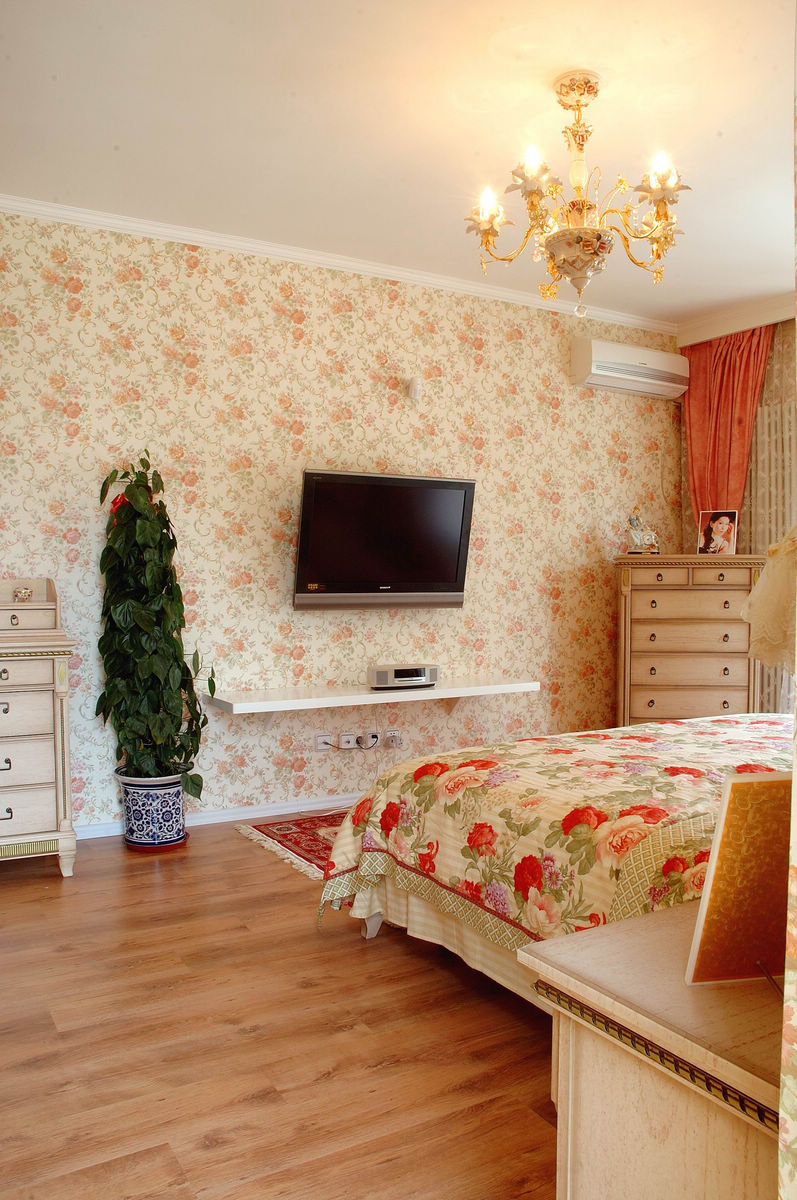 這是主臥的電視背景墻,整個(gè)家里的都運(yùn)用了這個(gè)溫馨色調(diào)的碎花壁紙,將田園風(fēng)進(jìn)行的很徹底。