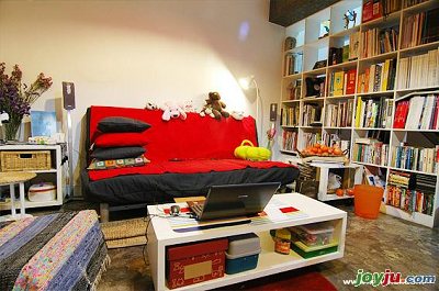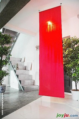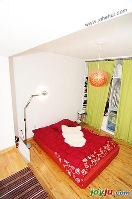 于是用了紅布簾子做了軟隔斷,一來空間層次更分明,而來也呼應(yīng)一下窩里的主題色。